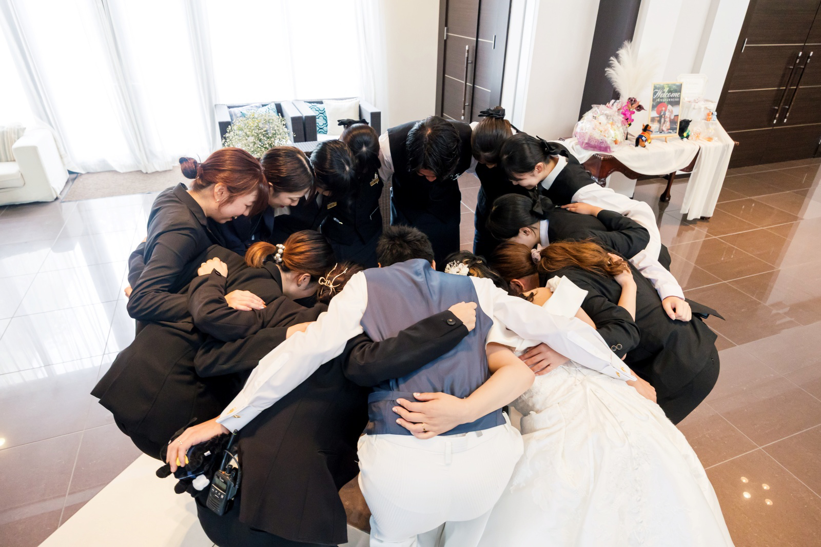 スタッフとおふたりはおもてなしのチーム。円陣を組んでパーティースタートに向けて心を一つにします。