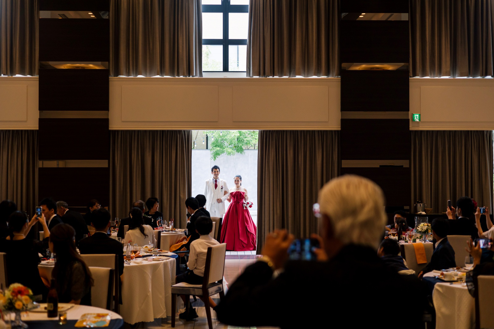 改めておふたりでガーデンからのご登場。おふたりの登場と同時に会場のカーテンが開く様子がとても素敵です!