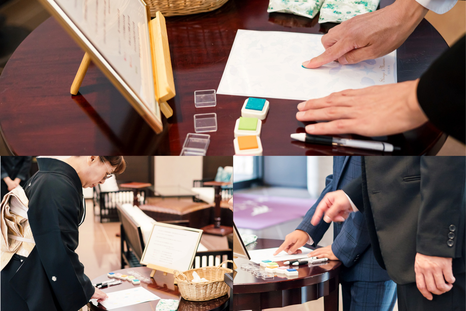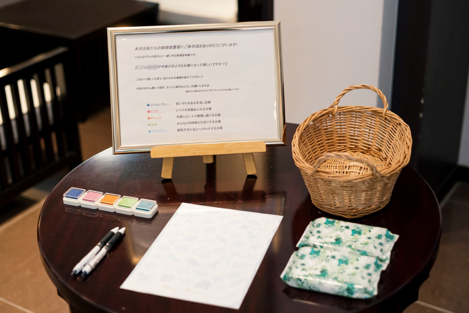 受付には押印式の結婚証明書を。今後おふたりにはどんなご夫婦になってほしいですか?という問いかけにそれぞれ押印と署名をして頂きます。■コバルトブルー―:思いやりのある仲良し夫婦■ピンク:いつでも笑顔あふれる夫婦■オレンジ:何事にも二人で挑戦し続ける夫婦■黄緑:みんなとの時間を大切にする夫婦■アクアブルー:競馬が当たるとハイタッチする夫婦