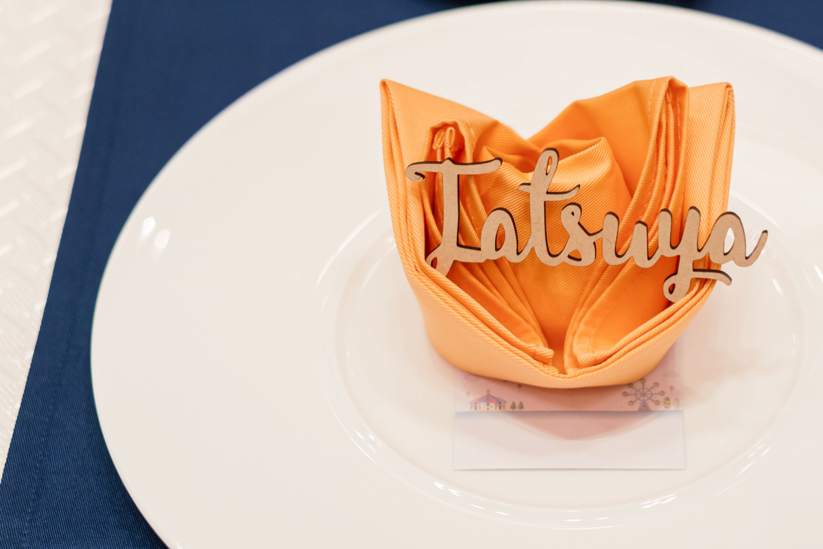 ゲストのお席には素敵な席札とおふたりからのメッセージカードが。おふたりのご入場までの間、お一人お一人がメッセージを読んで笑顔に。