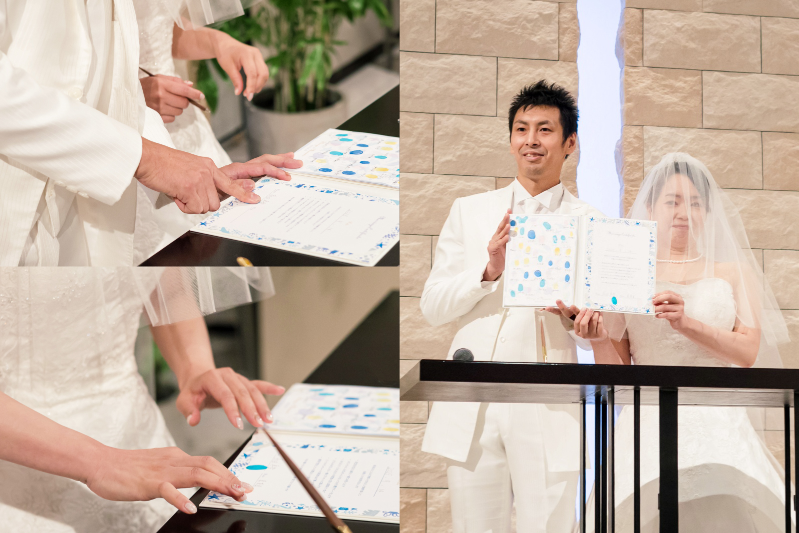 ゲストの皆様に署名と押印をして頂いた結婚証明書に、おふたりも署名を。
