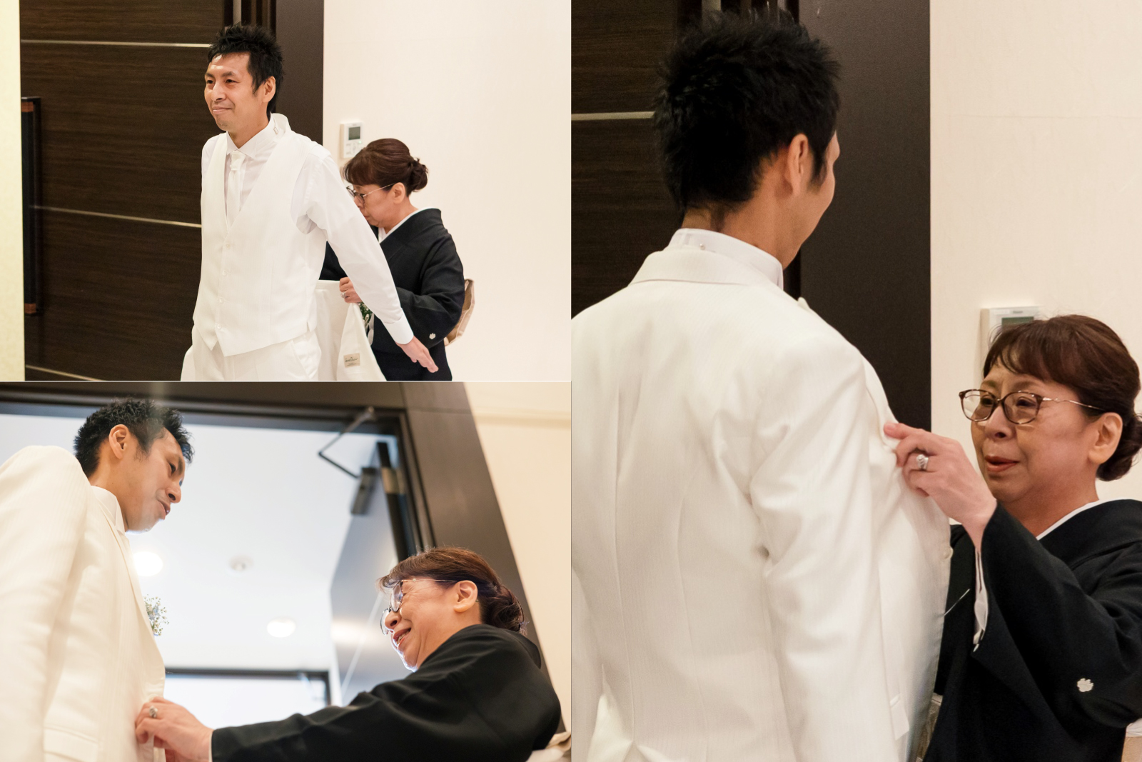 ジャケットセレモニー。新郎様のお支度をされるお母様。笑顔もこぼれる幸せな時間になられたのではないでしょうか。