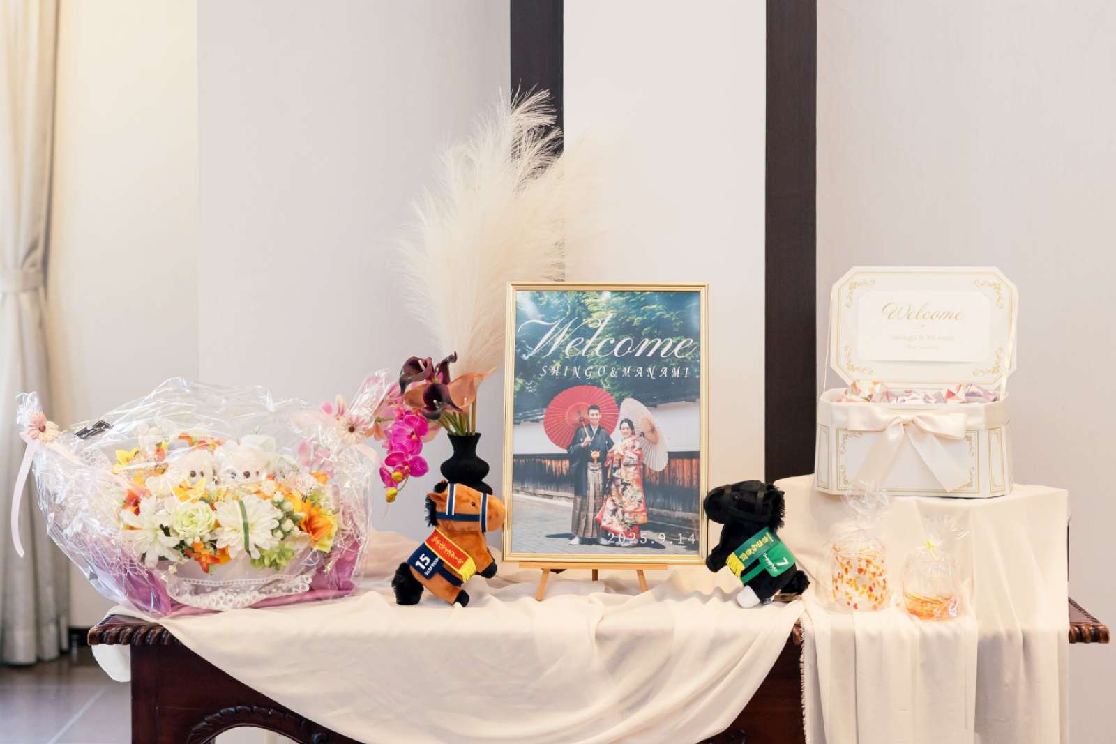 ウェルカムスペース。和装姿の素敵なおふたりのお写真がお出迎え。